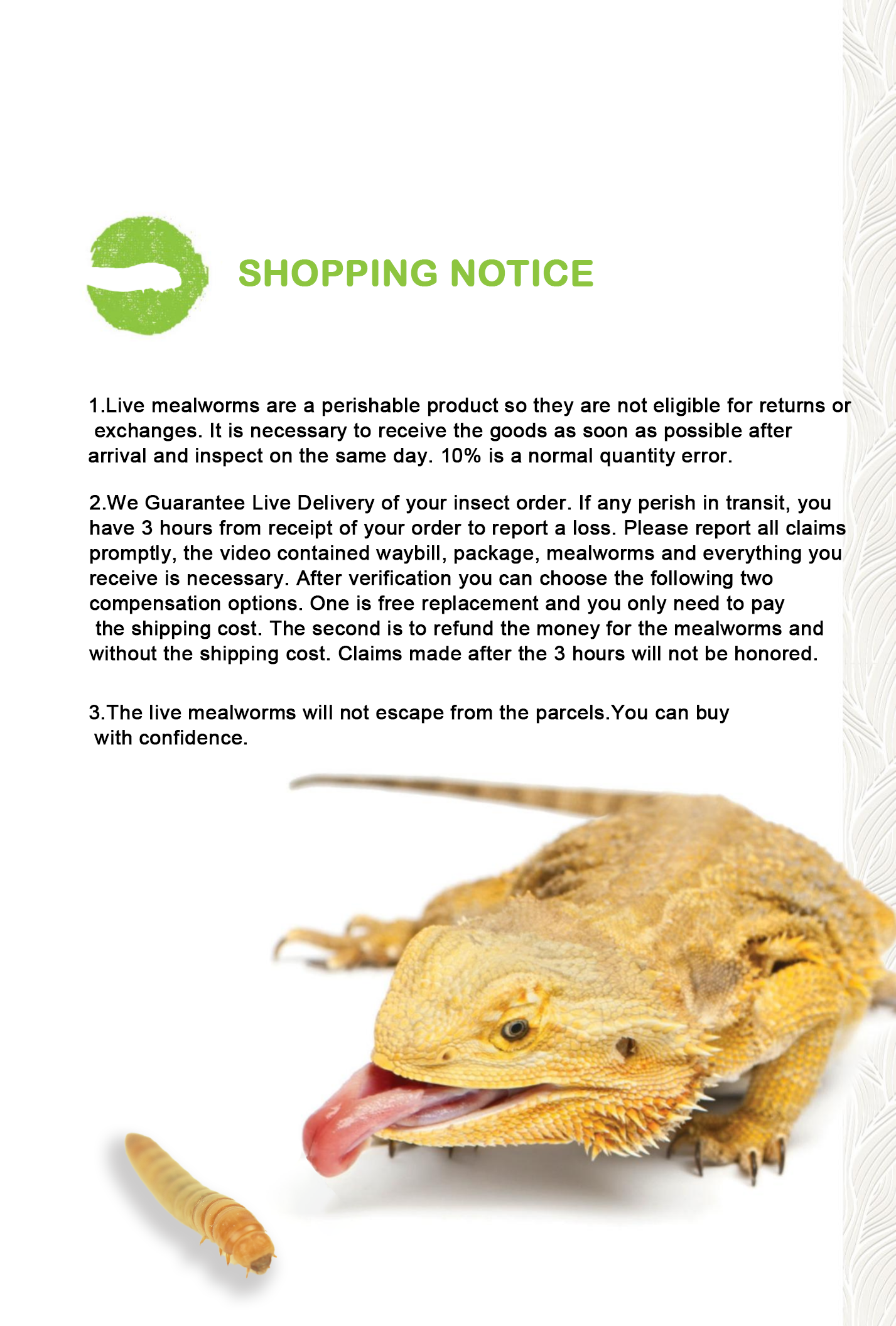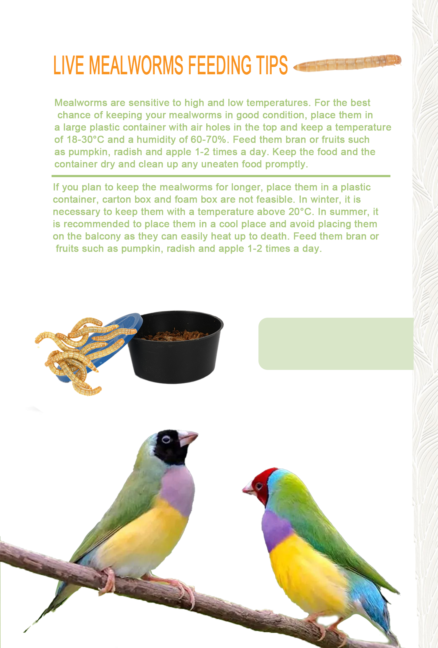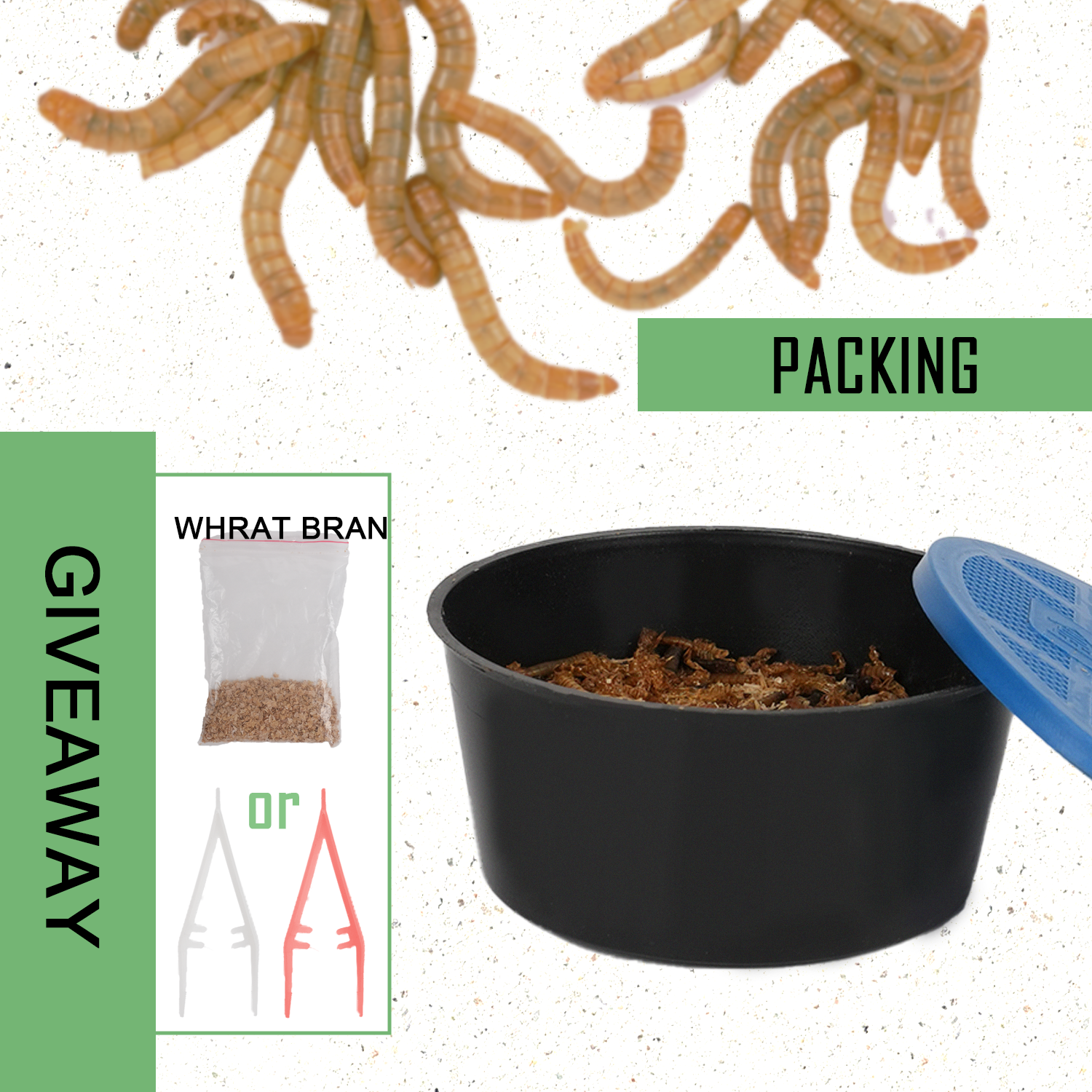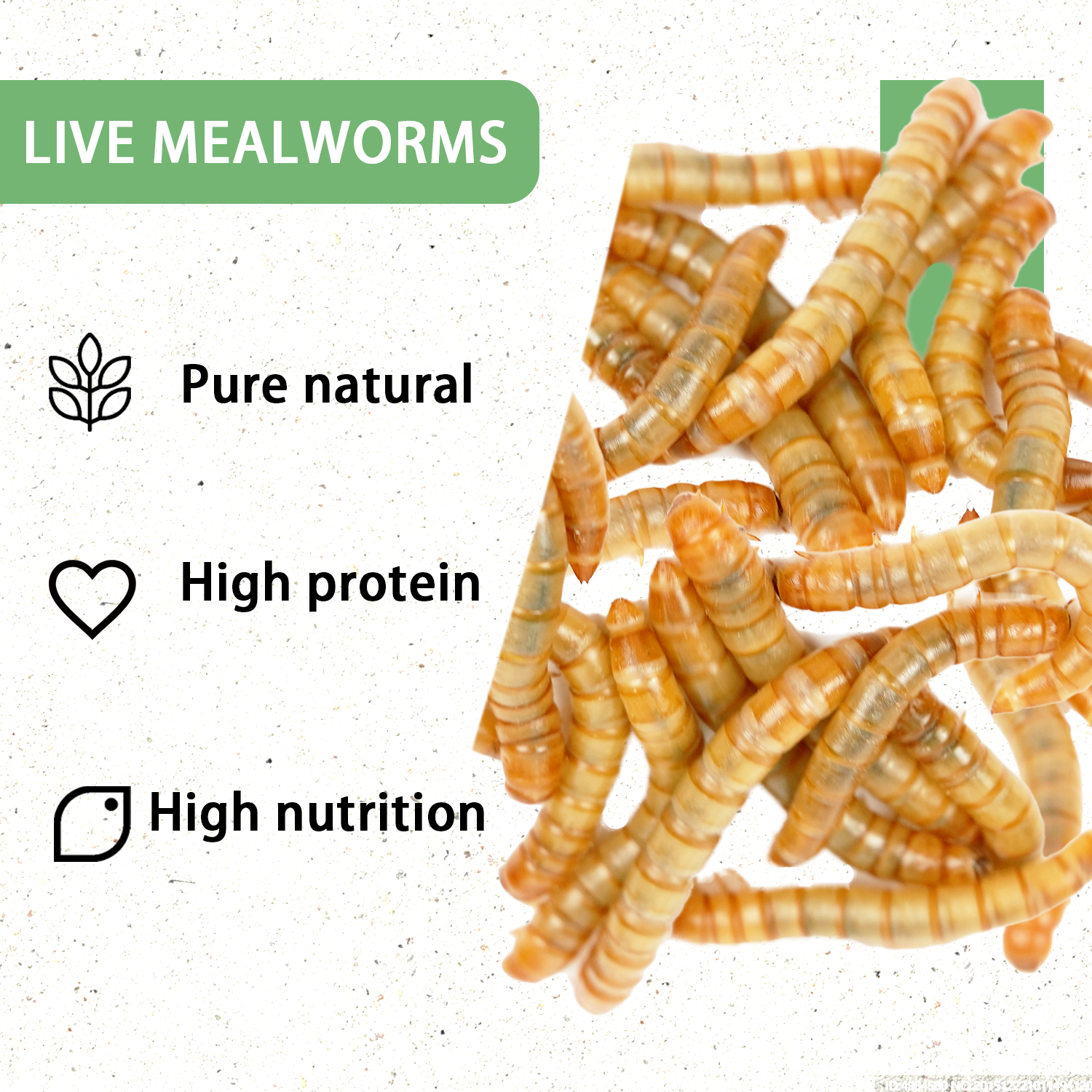 The live mealworms are a great source of protein for the pet reptiles, birds, or fish. With a high percentage of protein and essential nutrients, these worms are a healthy addition to the pet's diet. Easily digestible and full of energy, they will keep the pets happy and thriving.